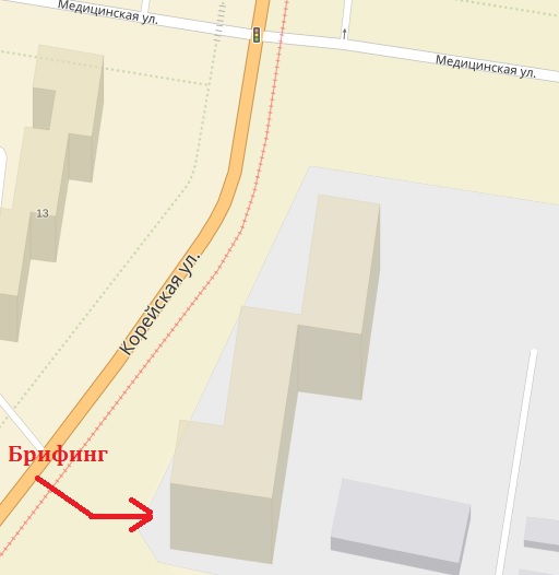 Локация напротив ул. Медицинская, 13. Брифинг у пристроя. Паркуйтесь, где хотите, только не мешайте местным жителям.