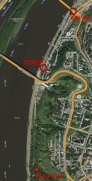Казино. Играем в рулетку, покер, казино. Разрешается произвольно перемещаться между всеми играющими локациями. Но мы советуем на рулетку отправляться игрокам с зоны 1 и 5. А на покер и Blackjack - 2,3 и 4. Рулетка: Для решения каждого сектора рулетки необходимо получить префикс от агента в круглом бункере по координатам 56.319208, 43.974509. (От улицы Ярославской спускаемся по лестнице вниз. Первый поворот направо. Через метров 50 слева увидите вход в бункер). И найти соответствующий безметочный код на локации по адресу Казбекский переулок, 2 (Рядом Соревнований, 1). 56.319917, 43.976751 На этой локации ведем себя максимально тихо. Карта рулетки: Карта Формат ответа: префикс+код без пробела. Пример ответа: АБВКОД1. Каждый код закроет 1 сектор. __________________________________________________________ Карта покера и Blackjack. Карта Коды, соответствующие картам для обеих карточных игр, Вы сможете найти в двух опорах канавинского моста. 56.325771, 43.977156 Залазить через верх, есть направляющие со старых игр. Советуем сюда бежать игроку с зоны 3. Покер. Играет Ангар у Мукомола. На него советуем бежать водиелю с зоны 4. 56.318886, 43.971162 На месте Вы найдете три покерных стола. Около каждого стола спрятаны 2 карты (терн и ривер). В итоге у Вас будет полный расклад на столе. Вам нужно, чтобы игрок, у которого не видно карт, выиграл. К ситуации на столе, Вы можете добрать две любые карты из опор канавинского моста. В итоге Вам нужно ввести составной код из 5 карт - победной комбинации. Простыми словами. Ищем карты у стола. Определяем комбинацию, которой можно победить. И ищем карты в опорах моста. Формат ответа: составной код из 5 карт по алфавиту. Пример ответа: АБВГ ДЕЖЗ ИКЛМ ОПРС ТУФХ Каждый код закроет 5 секторов. Blackjack. Играет заброшенная автомастерская на улице Черниговской. Ближе все игроку с зоны 2. ПОСЛЕ ТОГО, КАК ЭТОТ ИГРОК ВОЗЬМЕТ ВСЕ, ЧТО ЕМУ НУЖНО, НАСТОЯТЕЛЬНО СОВЕТУЕМ БЕЖАТЬ В СТОРОНУ АНГАРА НА ЧЕРНИГОВСКОЙ ИЛИ ПОМОГАТЬ СВОЕЙ КОМАНДЕ. На месте ищем метку. Она подскажет сколько карт рядом с ней. Это даст вам расклад в конкретном раунде. Вам останется дополнить этот расклад одной картой, чтобы получить 21 или blackjack. Правила подсчета очков: 2,3,4,5,6,7,8,9,10-соответствующее количество очков, валет-2, дама-3, король-4, туз-11 (приходящий к 20 очкам считается за 1). Простыми словами: ищем у метки указанное количество карт... нужно одной картой добрать до 21. Берем все карты у метки + нужную дополнительную карту и вбиваем составняк кодами с опор канавинского моста. Формат ответа: составной код из нужного числа карт (число карт у метки + 1) по алфавиту. Пример ответа: АБВГ ДЕЖЗ ИКЛМ ОПРС ТУФХ Каждый код закроет 3 секторов.
