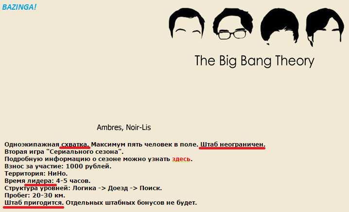 djioan: ... если вы рекламируете игру как лайт, так постарайтесь ее делать таковой... "мыло да мочало, начинай сначала!" лайт? вы откуда такие выводы делаете? отдельно хочу обратить ваше внимание на пункт "время лидера". Выходя на игру, понимайте заранее, насколько вы можете достичь времени лидера ;-) И многие здесь готовятся морально и физически. Тот же Нюр, навряд ли он готовился доигрывать в одиночку. И ещё кое-что про время лидера, не помню, откуда это пошло, но "лидер похоже не приехал на игру"